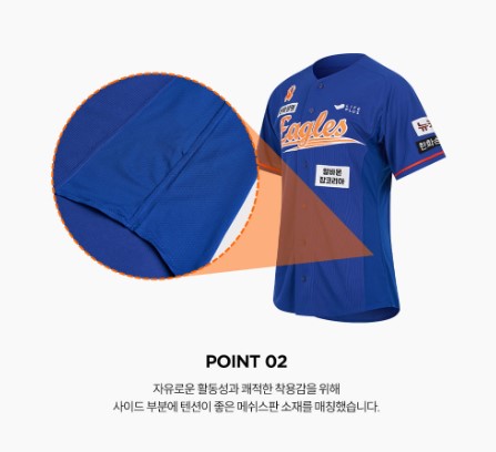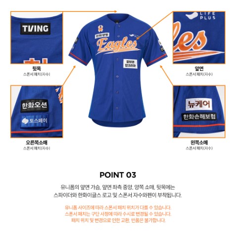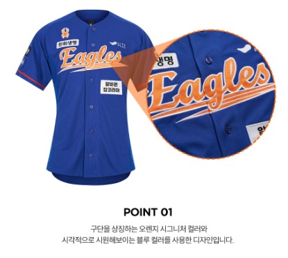 기본적으로는 썸머 유니폼에 가장 적합한 블루 컬러를 배경색으로 활용하고, 동시에 한화이글스를 상징하는 오렌지 컬러로 로고를 꾸미고 있습니다.
