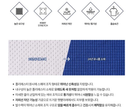소재상의 특징으로는 폴리에스터 원사에 스퀘어 조직 형태를 갖추면서 신축성이 더 좋아졌다고 합니다. 또한, 내구성이 뛰어난 폴리에스터 소재를 사용해서 오랫동안 새 옷처럼 착용감을 유지할 수 있다고 하네요.